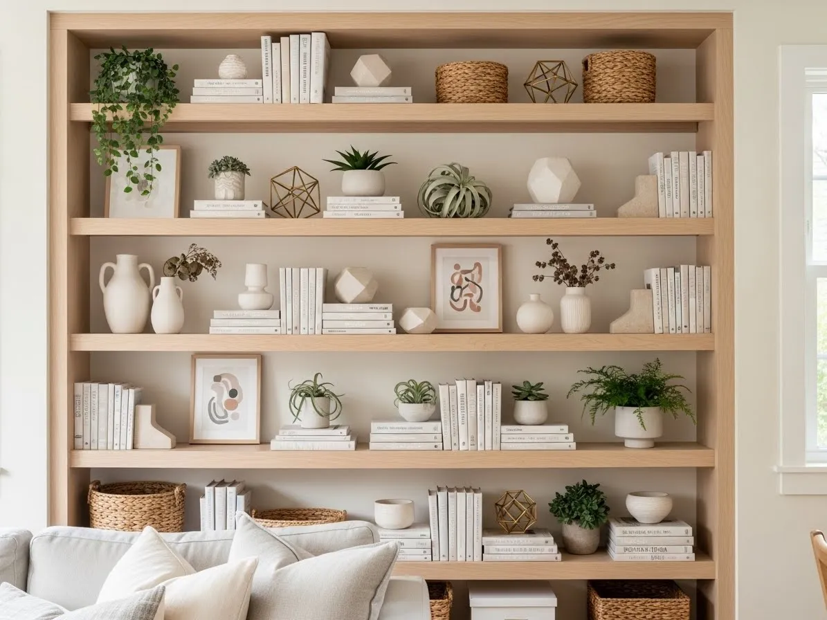 Open shelves can be both functional and beautiful when styled thoughtfully. Use them to display a mix of books, décor objects, plants, and baskets.