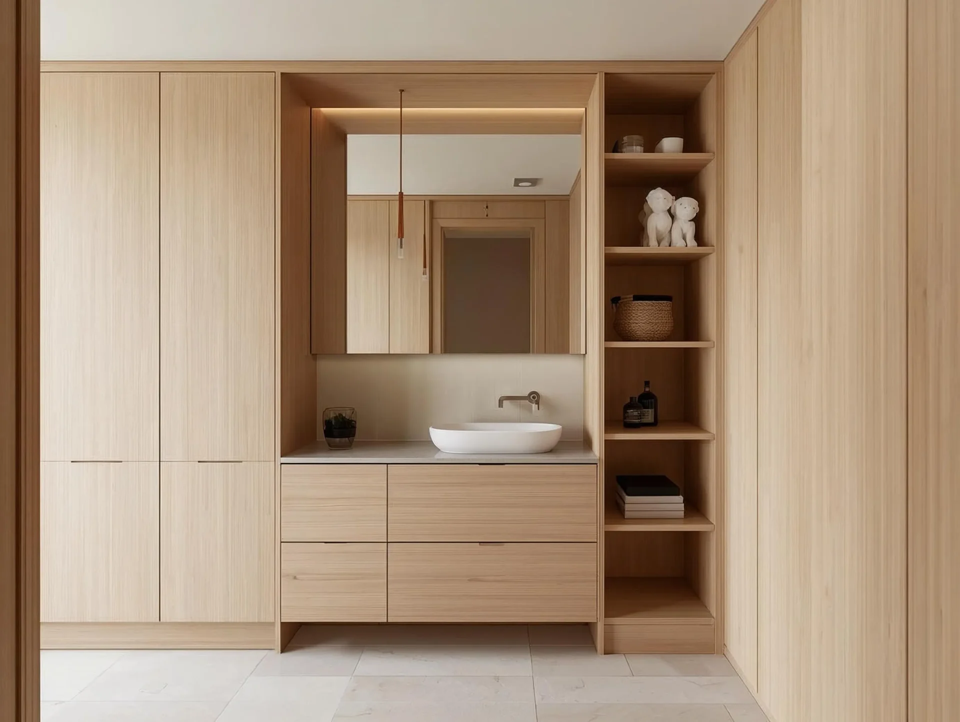 Wood-clad mirror niches are a practical and elegant storage solution for Japandi bathrooms. They store toiletries and add sophistication. The wood cladding keeps the natural and minimalist look of Japandi design.