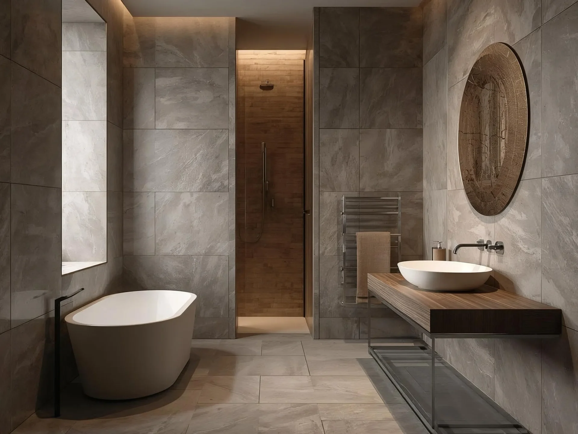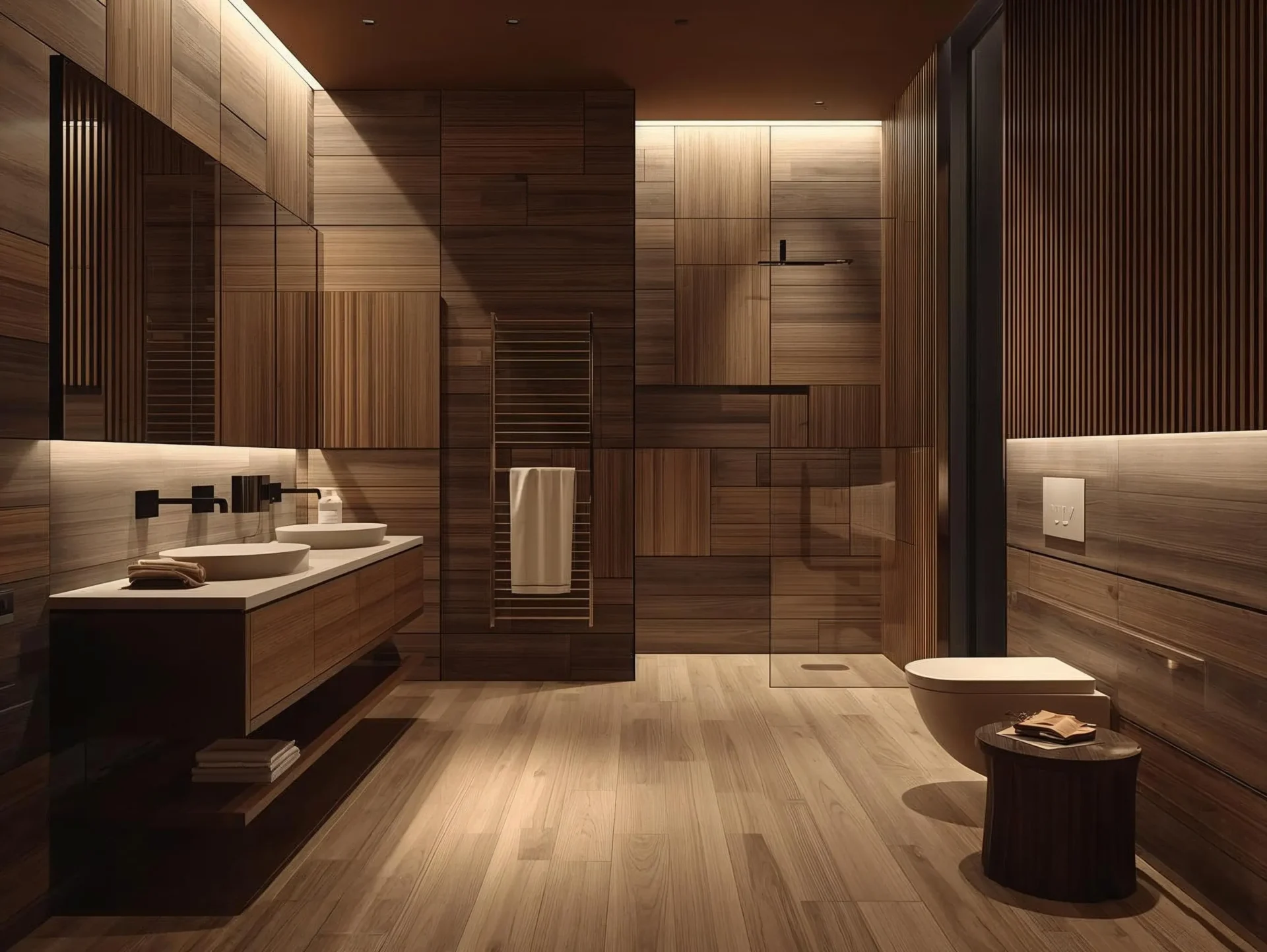 Wood cladding on ceilings adds warmth and texture, enhancing the calming ambiance. It creates a cohesive and enveloping atmosphere in the bathroom.