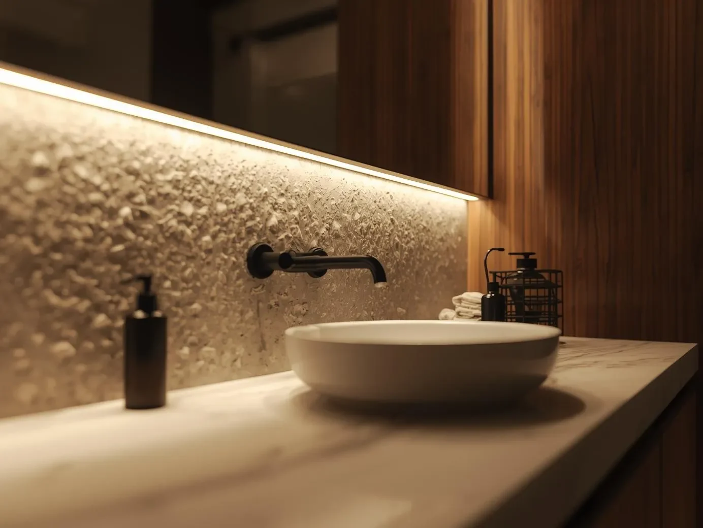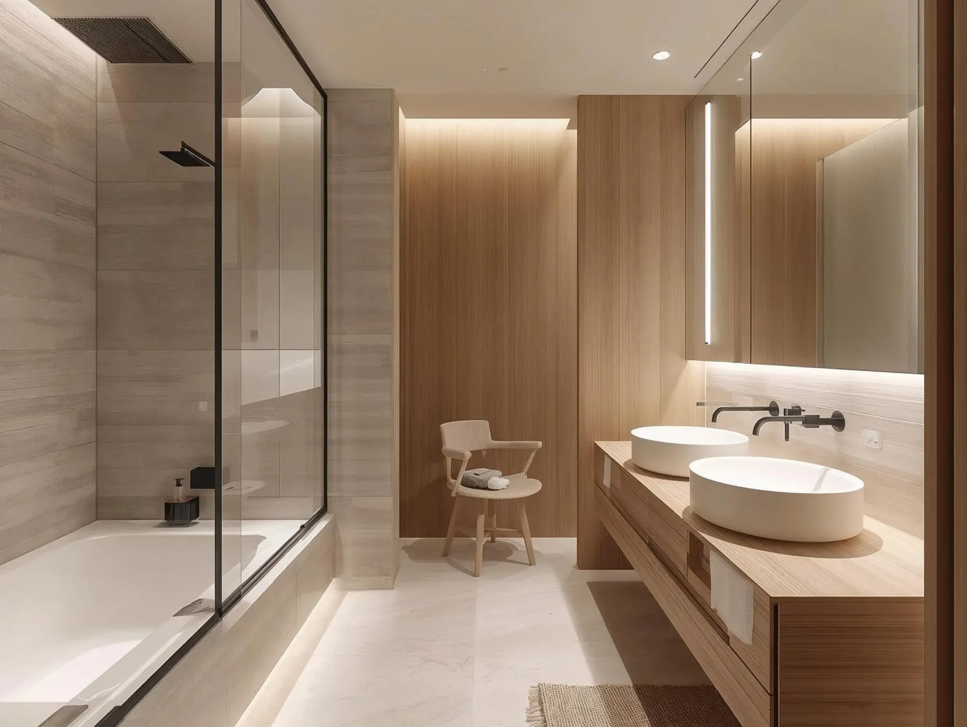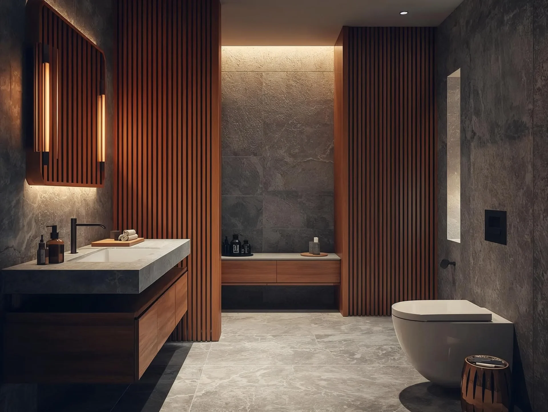 Integrated lighting like LED strips under vanities or in niches adds to the bathroom’s feel and use. These lights are designed to be quiet, improving the space without being too much.