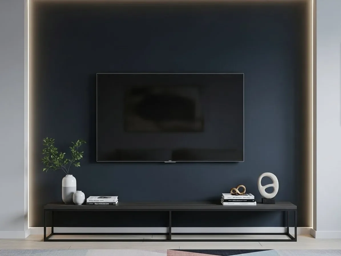 Darker shades like charcoal, deep green, or navy make the TV blend in and reduce glare. Warm neutrals also work for softer spaces.
