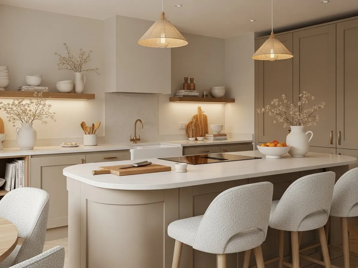Warm neutral tones like beige, greige, or soft taupe paired with a curved design create a timeless and welcoming kitchen. These colors enhance the softness of the curve and work well with a variety of styles.