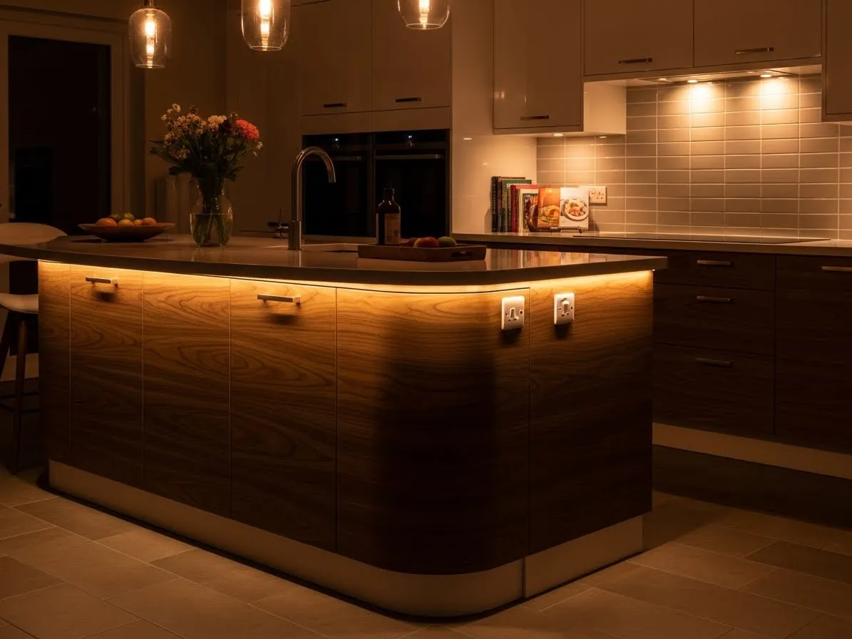 Integrated lighting helps emphasize the curve of the island while creating a warm and inviting atmosphere. Under-counter lighting or soft pendant lights can highlight the island’s shape, especially in the evening.