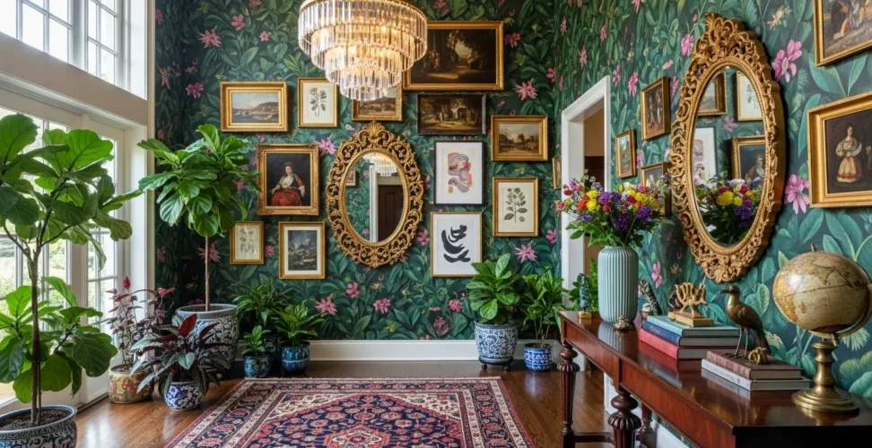 Maximalism is playful — and that means adjusting your entry elements seasonally. Bright ceramics in spring, vintage brass in fall, and festive textiles during holidays add layers that evolve with time. (Inspired by trending floral drenching in entryways by designers — floral wallpapers included!) (Homes and Gardens)