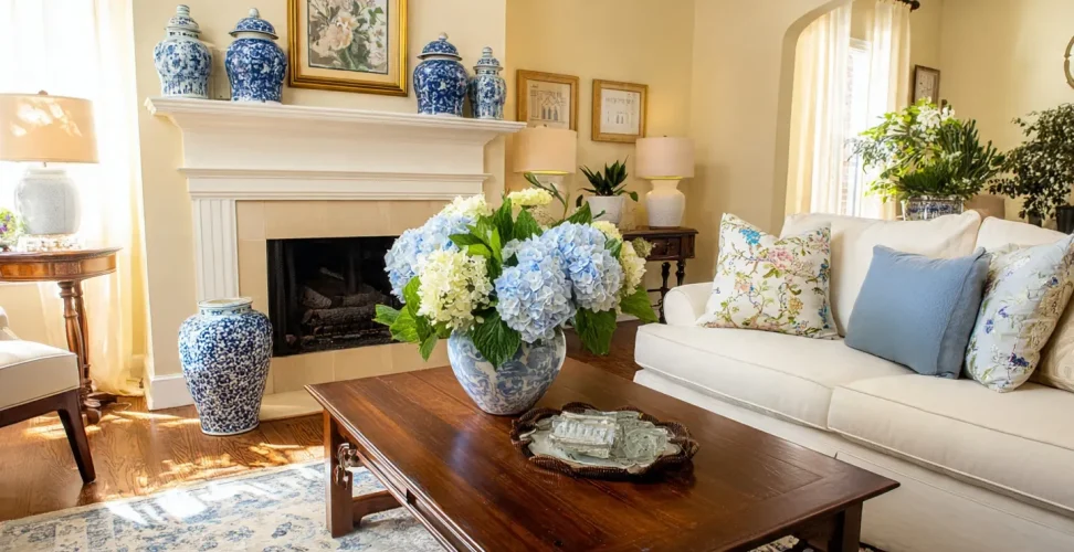 “Traditional Southern decor living room with blue and white accents, floral pillows, and a classic wood coffee table.