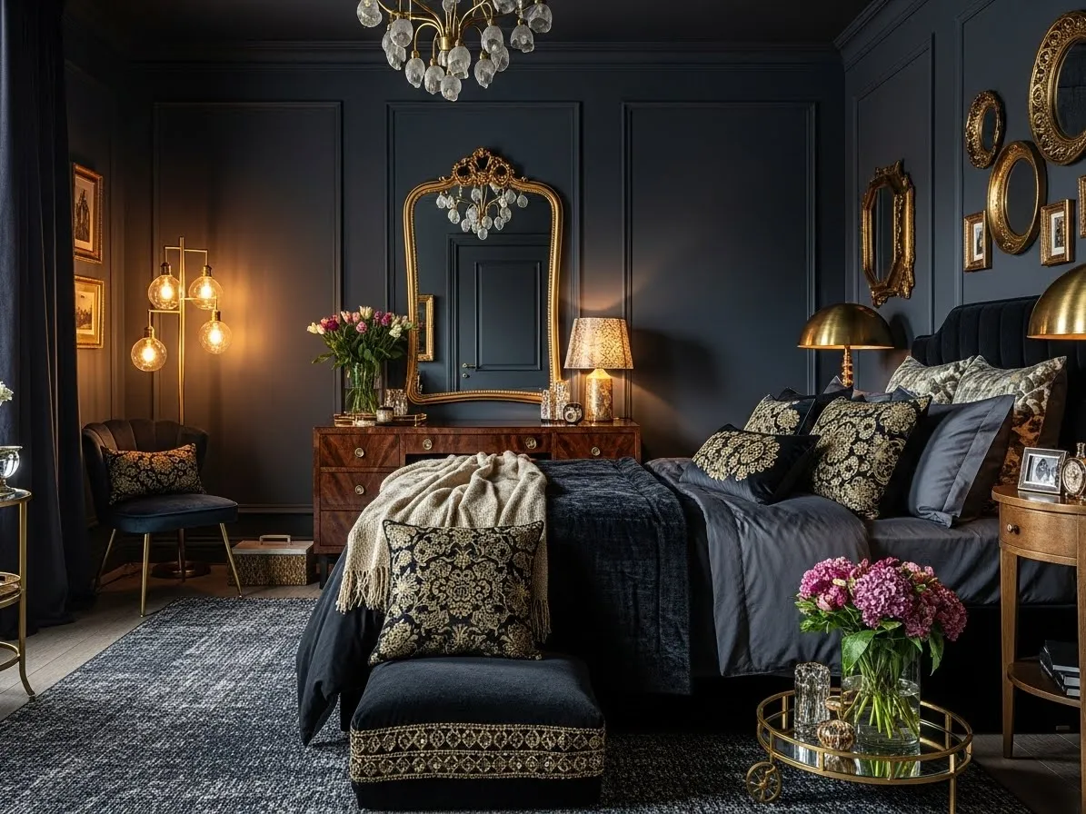 Metal accents instantly add warmth and luxury. Gold or brass lamps, mirror frames, or drawer handles reflect light and break up dark surfaces. These small details make the bedroom feel more polished and feminine.