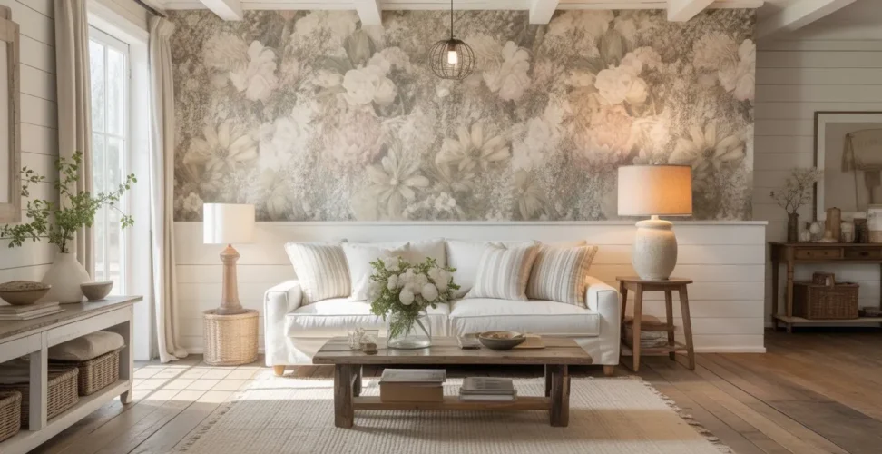 Delicate floral patterns bring warmth and nostalgia to farmhouse interiors. Choose muted florals in beige, sage, or dusty blue to avoid overpowering the room. This style works especially well in bedrooms, powder rooms, and cozy reading nooks.