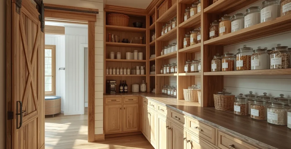 A sliding barn door is a showstopper that enhances farmhouse charm while saving space. It turns pantry access into a design feature and works beautifully with rustic or painted wood finishes.