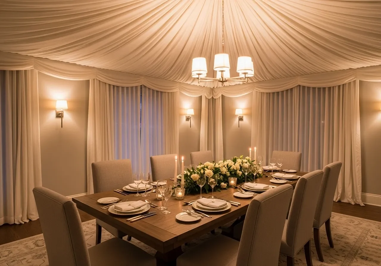 Turn your dining area into something special by draping fabric on the ceiling—especially over the dining table. It sets the stage for memorable meals and cozy gatherings.