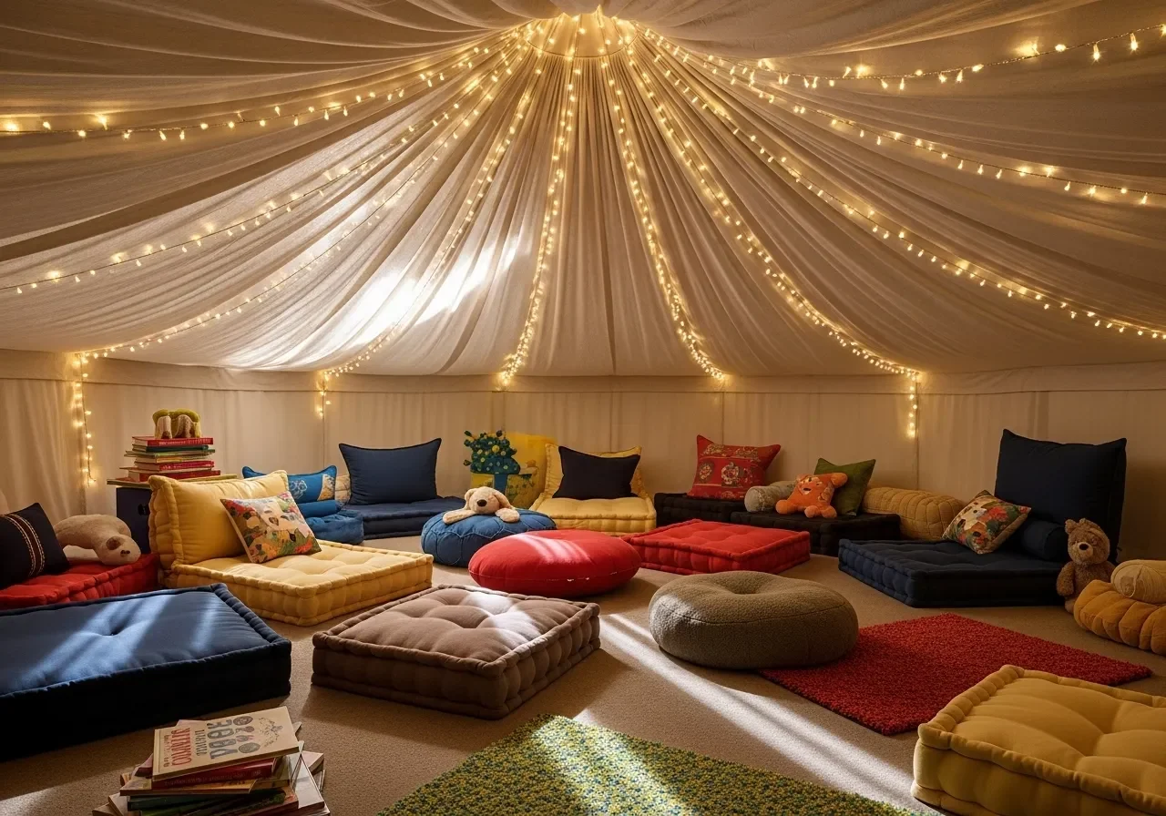 Want to add fun and whimsy? Pull fabric to a central point and create a tent‑like ceiling. Great for kids’ rooms, play areas, or spaces where you want to spark imagination.