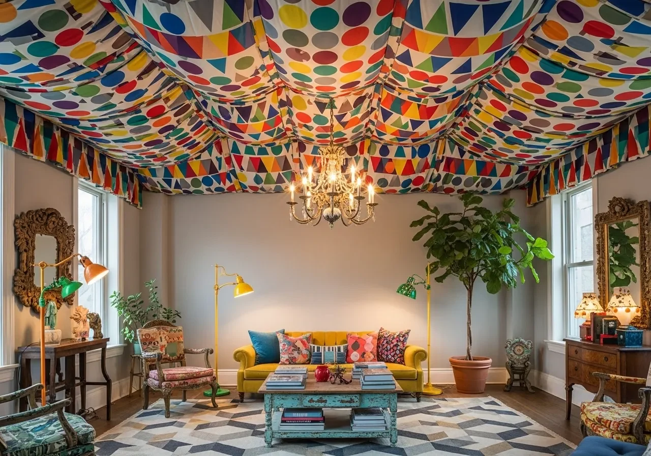 Wrap your ceiling in patterned fabrics for a free‑spirited, bohemian vibe. Think colorful tapestries, layered drapes, and a mix of textures. This look brings personality and fun into a room that might otherwise feel plain.