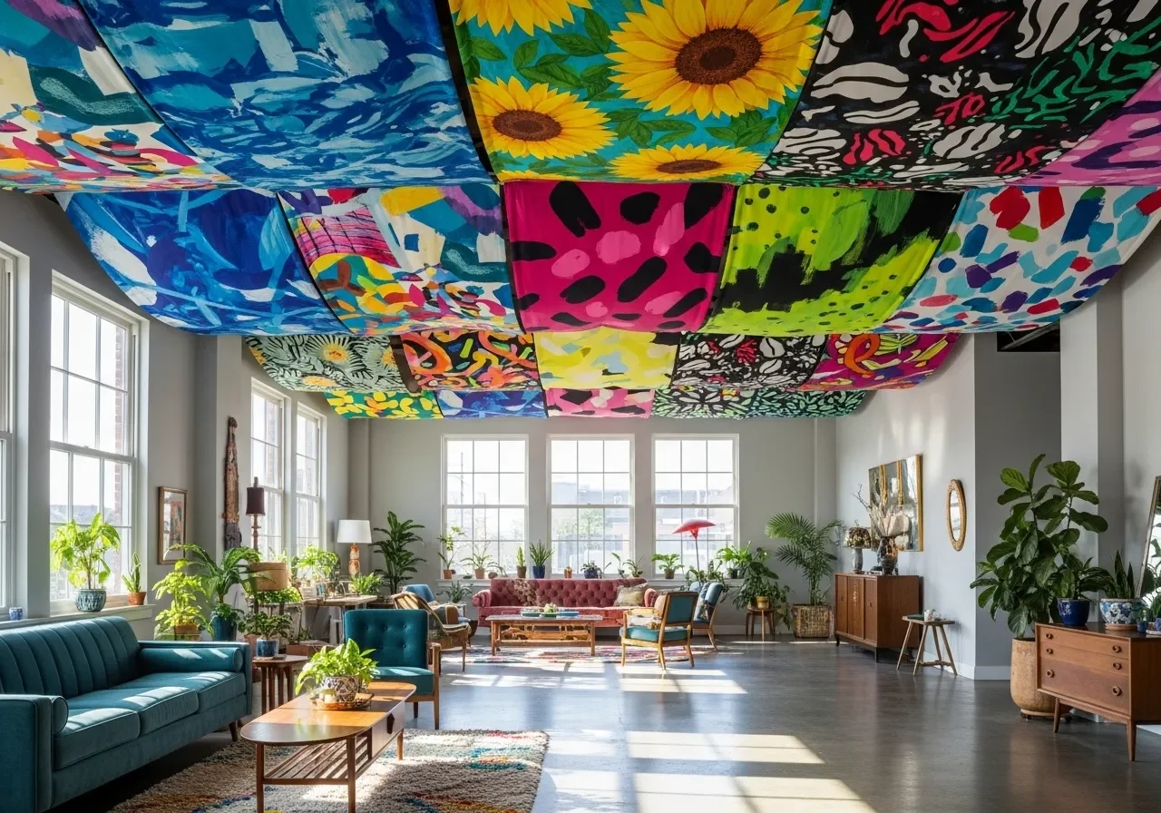 Your ceiling can be a canvas. Go bold with printed fabrics, large motifs, or hand‑painted designs. Perfect for creative souls looking to make a statement.