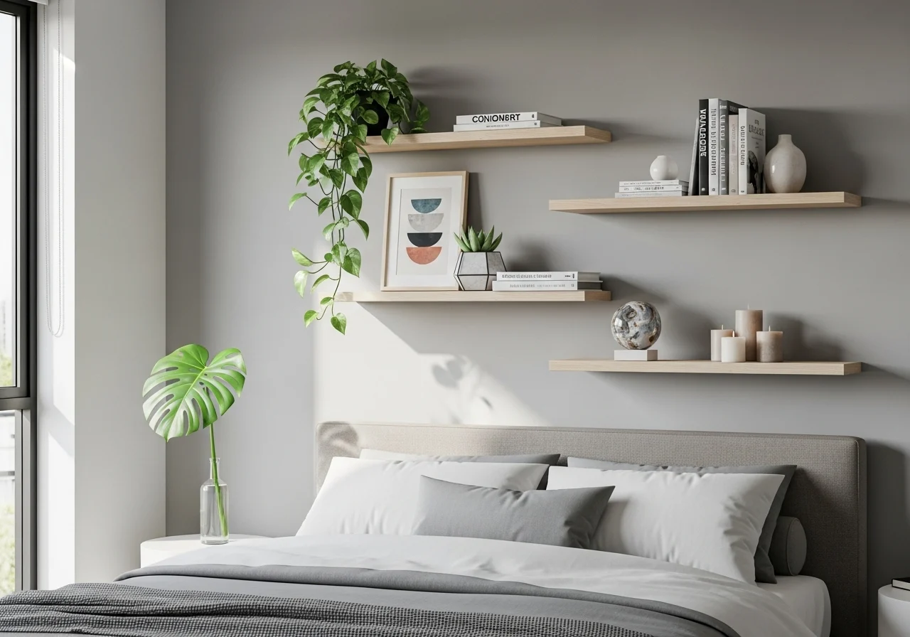Floating shelves allow you to display art, plants, and books in a curated way. This works especially well for modern spaces that need some personality but not too much clutter.