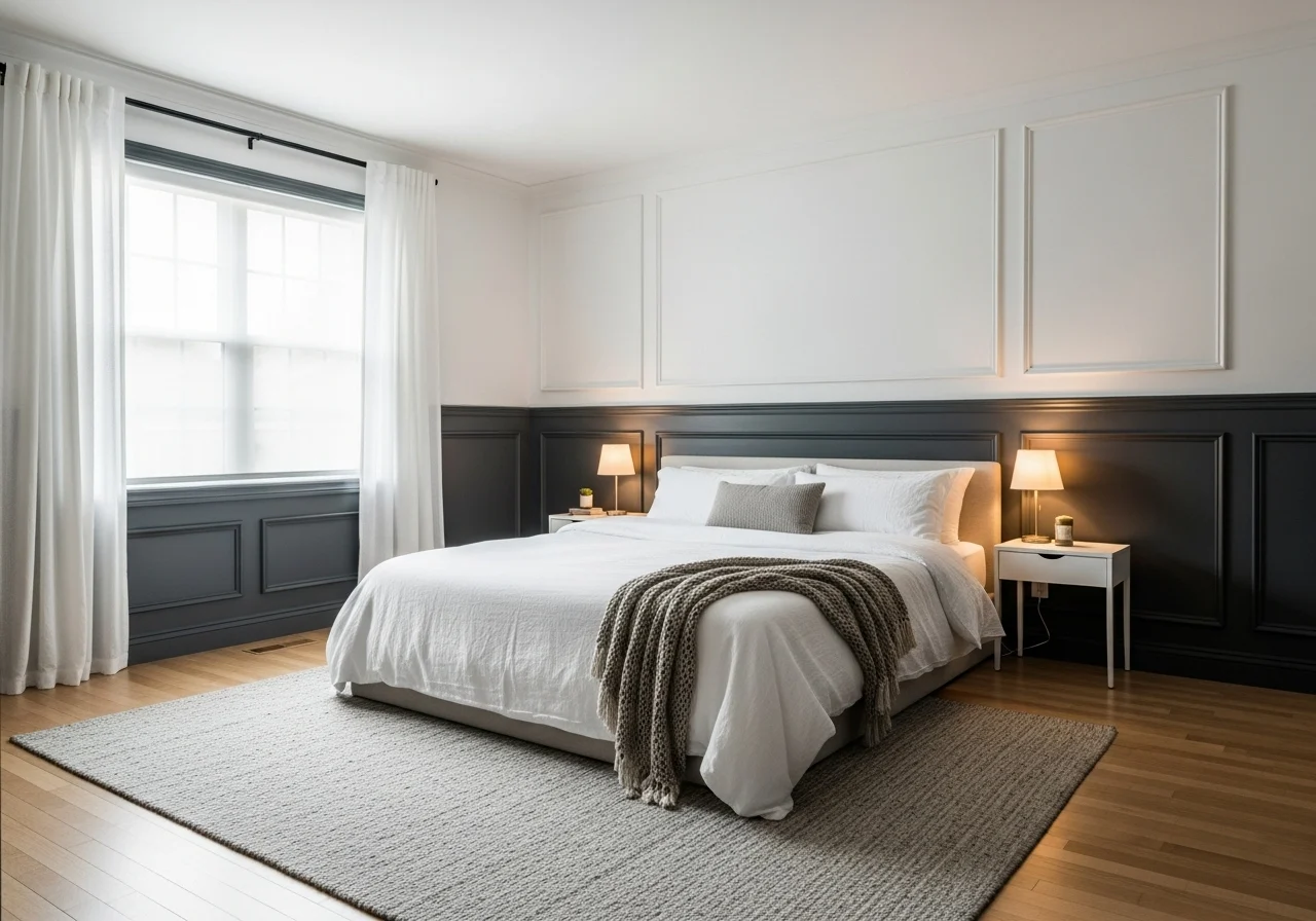 Wainscoting and paneling add structure and elegance to any bedroom. A contrasting colour makes the panels pop and creates a distinct look.