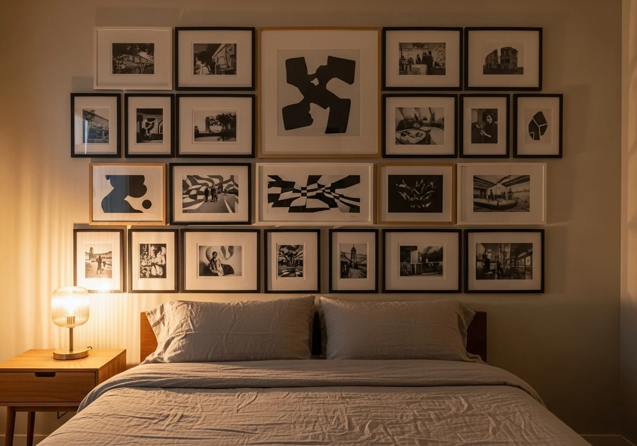 Use a collection of frames or photos arranged in a grid pattern for a visually engaging and modern feature wall.