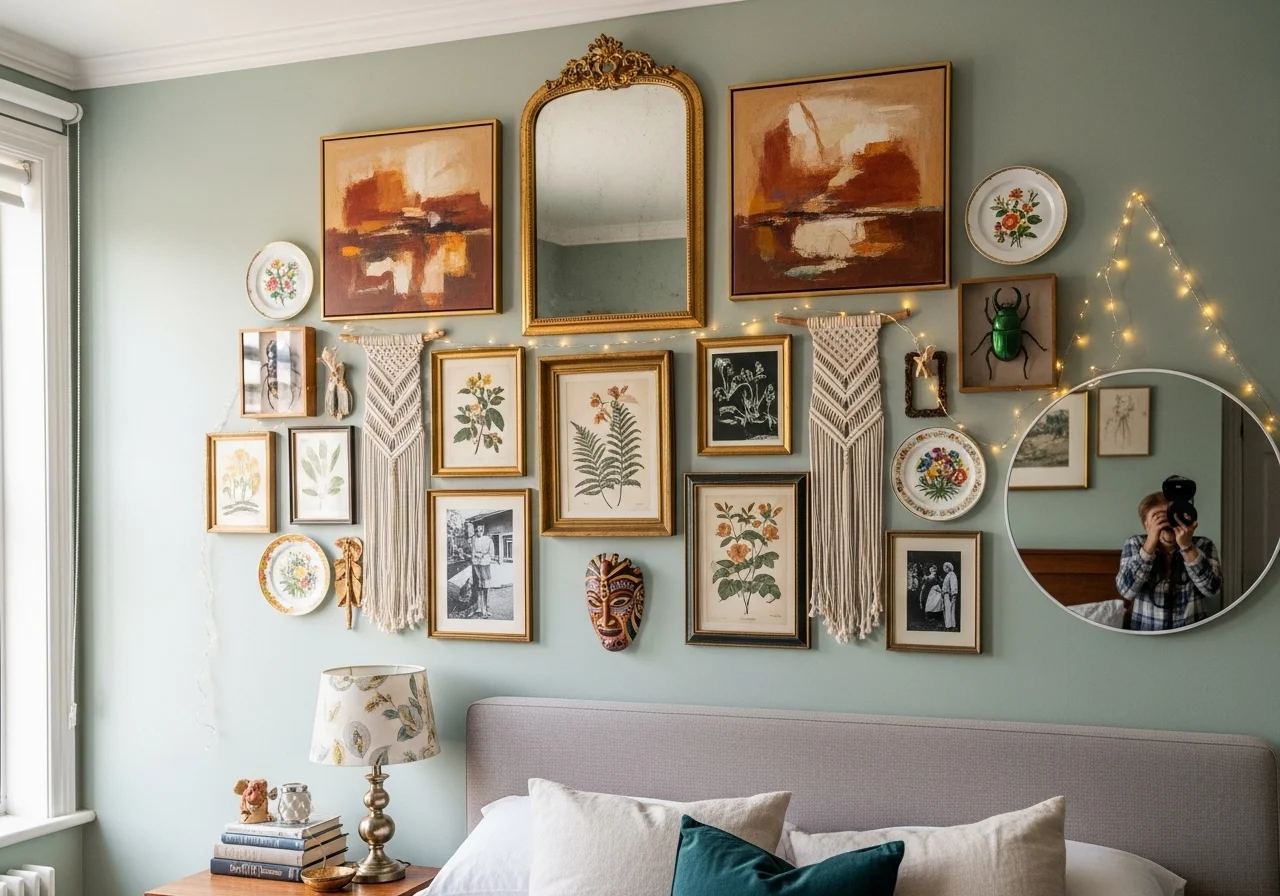 Curate your own wall display using a combination of art, mirrors, and unique objects for a layered look.