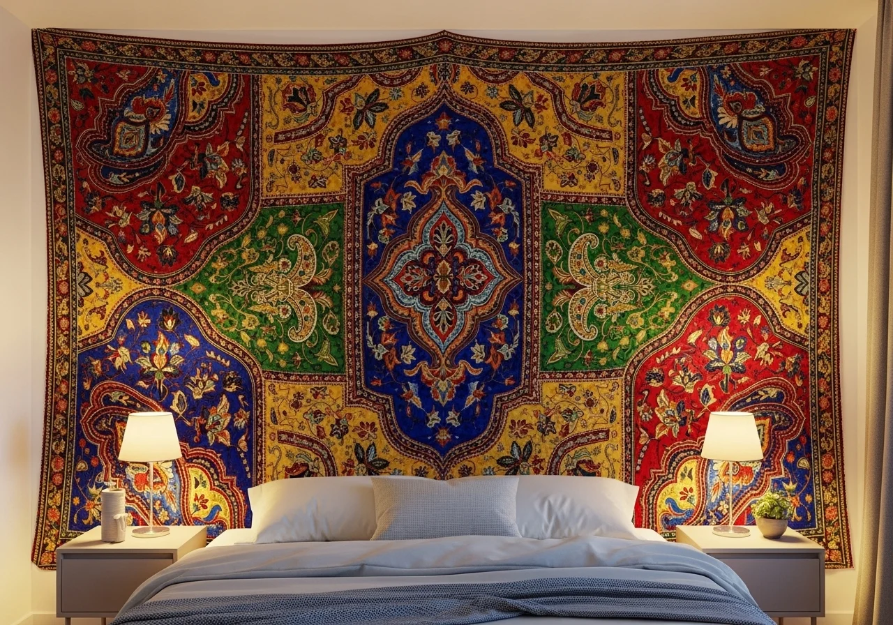 Instead of traditional art, hang large fabric pieces, such as tapestries or blankets, for a soft, vibrant focal point.