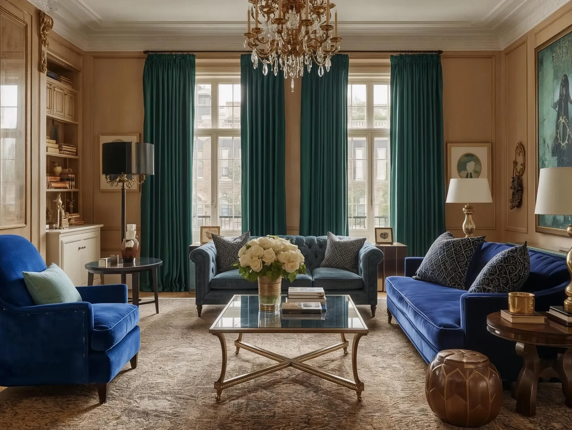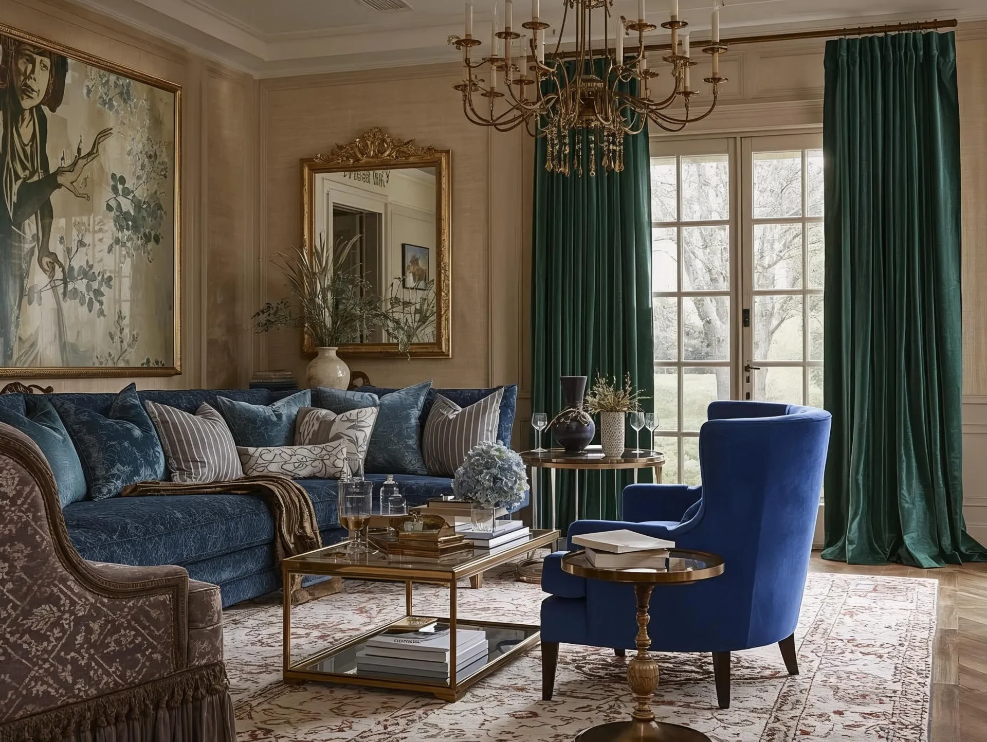 Jewel colors like sapphire blue, emerald green, and deep plum are no longer just “accent” colors — they’re becoming a relaxed luxury. Designers pair these rich hues with warm wood, brass, and soft neutrals to create a layered, elegant look.