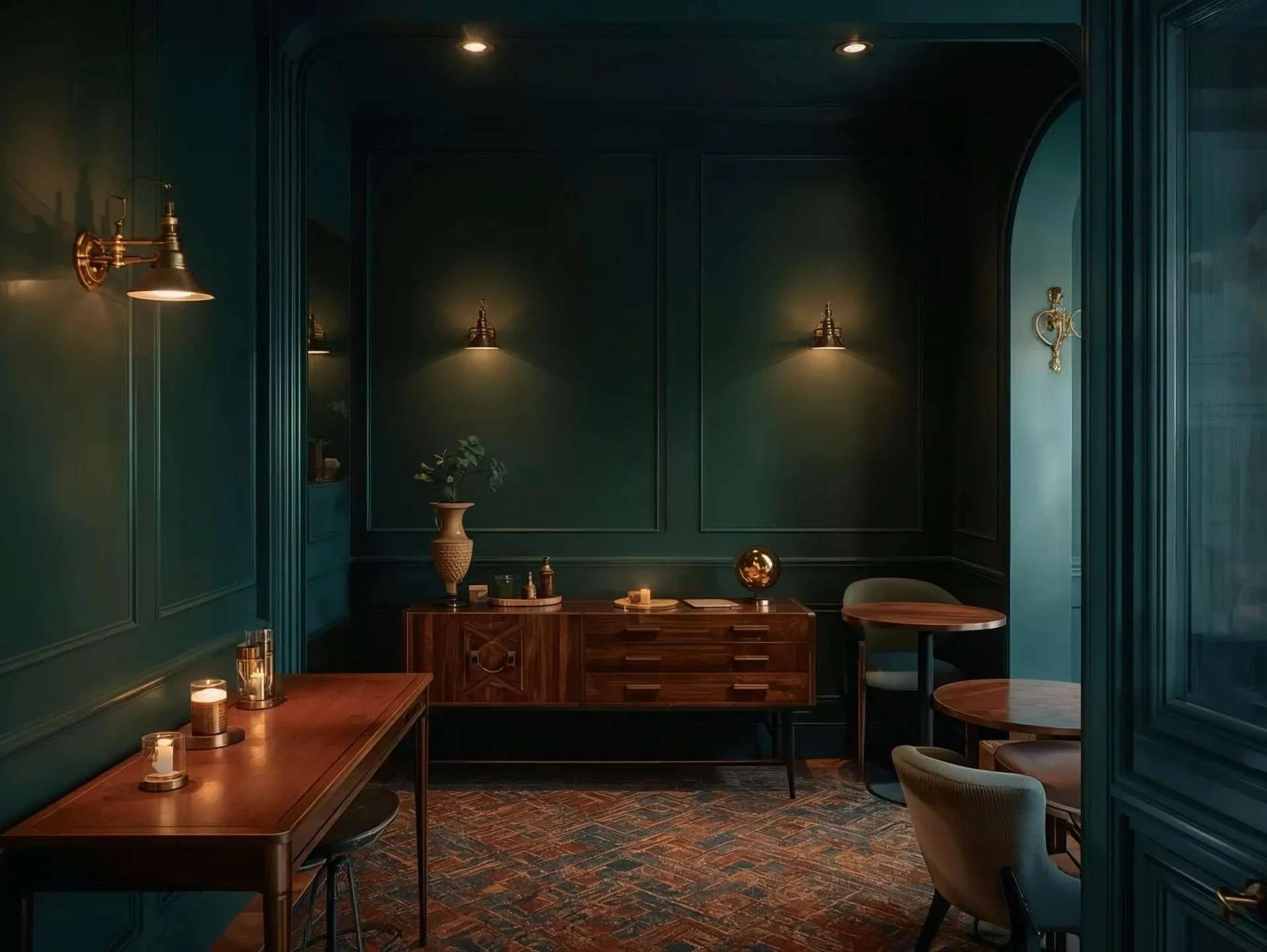 Look at the materials you already have — your floors, furniture, and lighting. If your home has a lot of wood or brass, earthy greens or khaki will feel natural. For cooler surfaces like marble or concrete, smoky jade or jewel tones could work beautifully.
