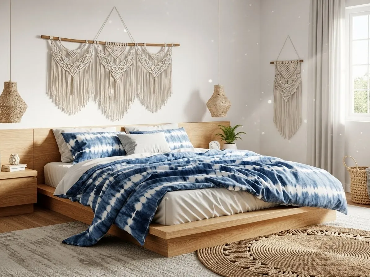 Tie-dye or softly patterned blue and white bedding adds a relaxed, beach-inspired vibe. Pair it with a light wood bed frame, macramé wall hangings, and a seagrass rug to complete the look.
