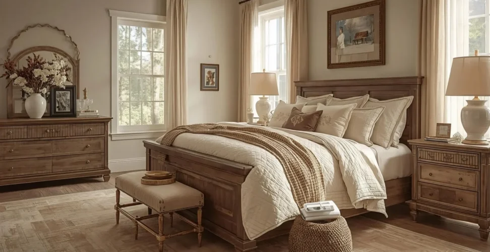 Luxury farmhouse guest bedroom with cozy layered bedding, rustic wood furniture, and warm neutral decor