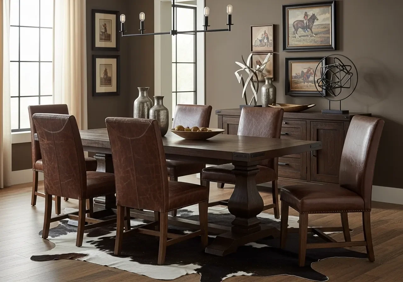 Leather chairs, cowhide rugs, and dark wood tables combine rugged charm with modern simplicity. Perfect for lofts or cabins.