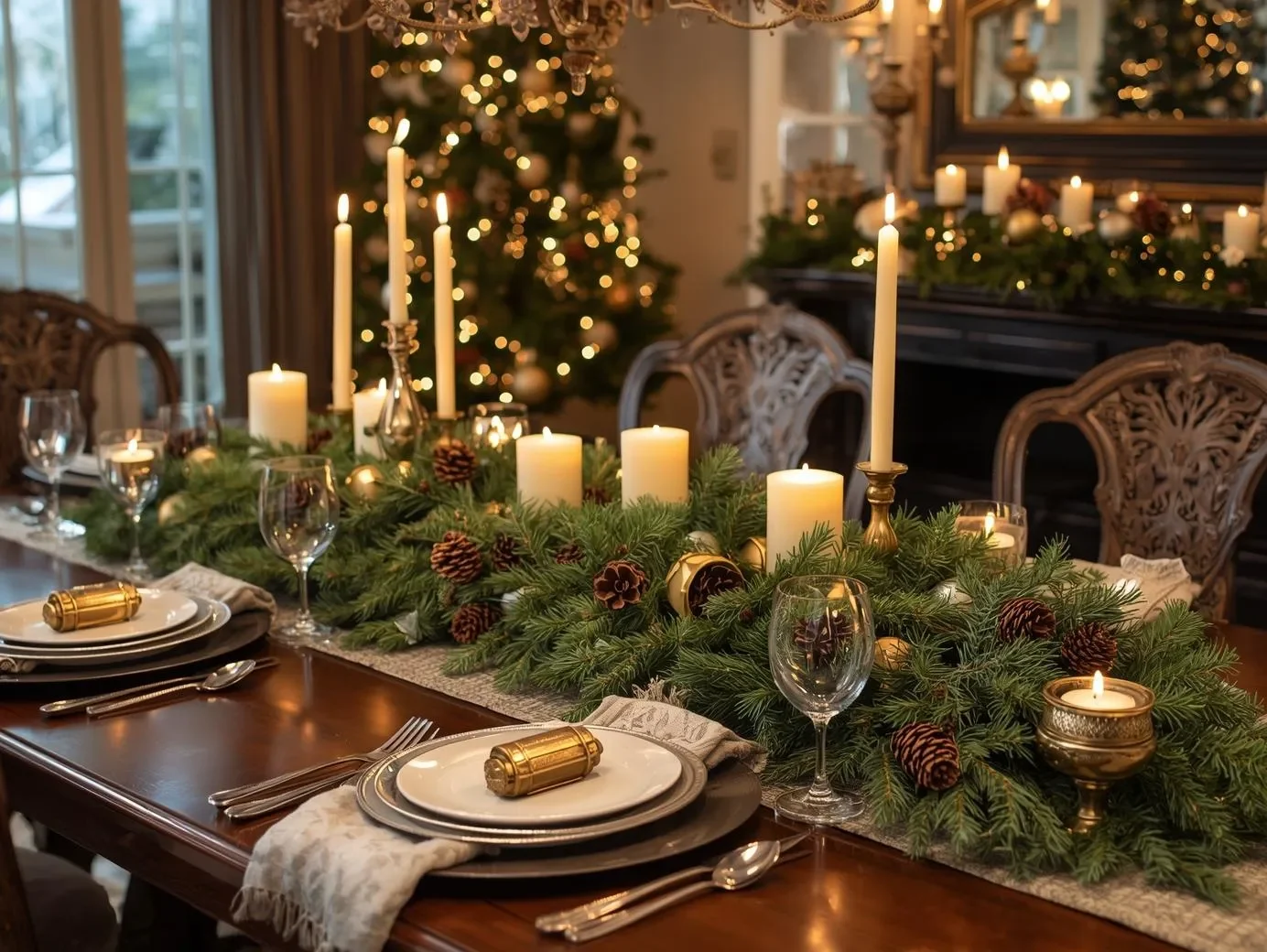 - Centerpieces with pine, candles, ornaments, or pine cones
