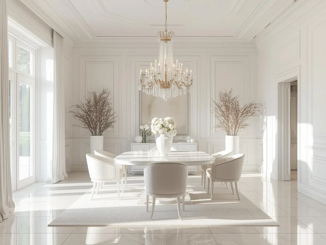 Luxurious All-White Dining Room Decor with Pastel Accents