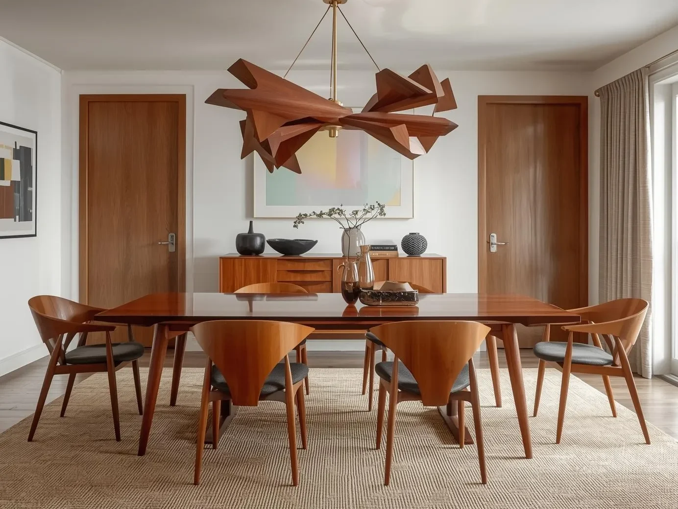 Bring timeless geometry and craftsmanship to your dining room. Teak furniture, angular chairs, and statement lighting like Sputnik chandeliers create retro charm.