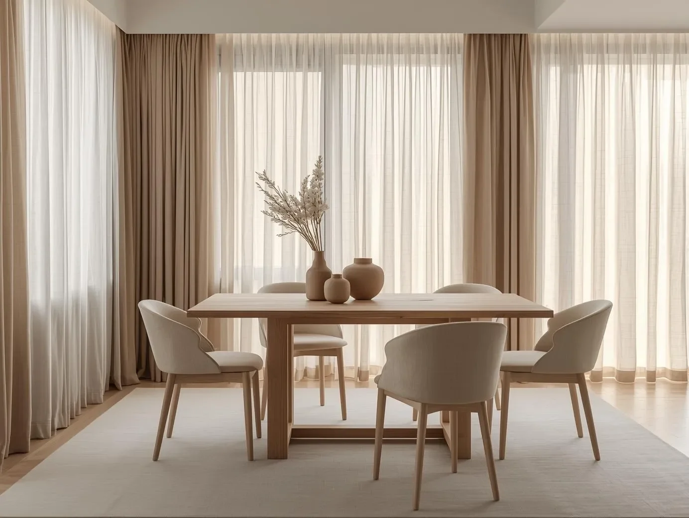 Modern neutral spaces feel calm and airy. Pale wood, cream, and soft gray make small spaces look bigger. Round tables with upholstered chairs create a simple yet elegant centerpiece.