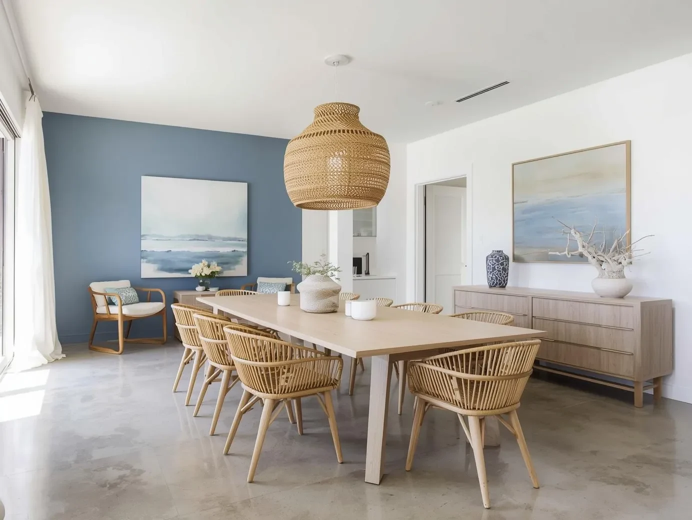 Fresh coastal tones with rattan chairs, woven pendants, and minimal décor evoke breezy, relaxed interiors. Keep it simple to avoid clichés.