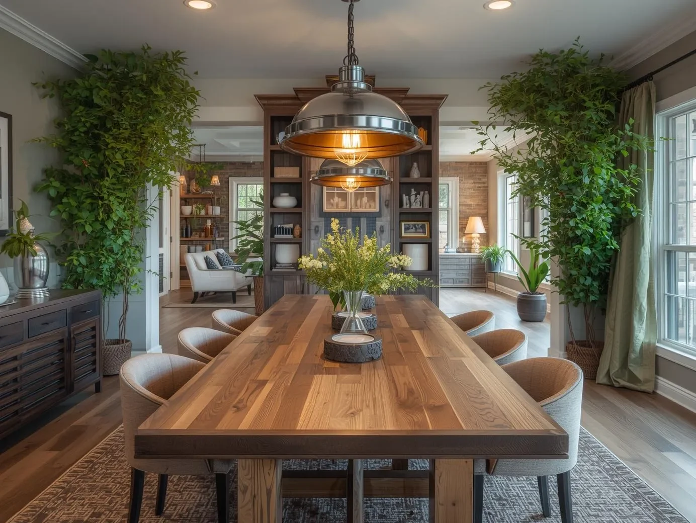 Farmhouse style blends warmth with modern polish. Reclaimed wood tables, metal fixtures, and creamy walls make the space inviting. Add greenery or wall baskets for extra charm.