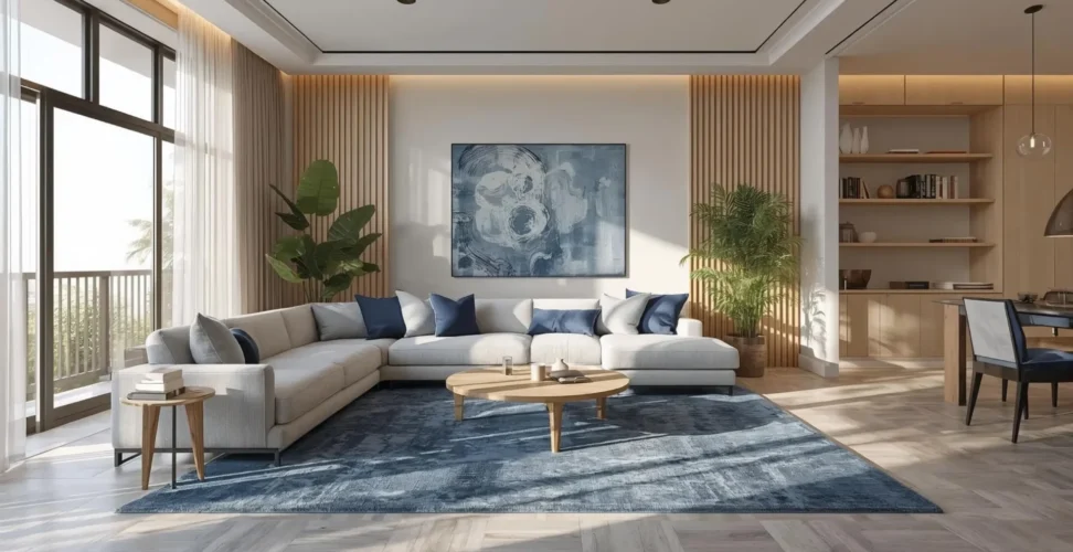 A blue area rug helps define the seating zone while tying together multiple design elements. In open-plan homes, this is especially effective for creating structure in a living room with blue accents.