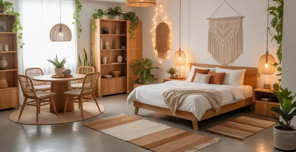 A warm and relaxing studio apartment decorated with soft colors, plants, and cozy textures.