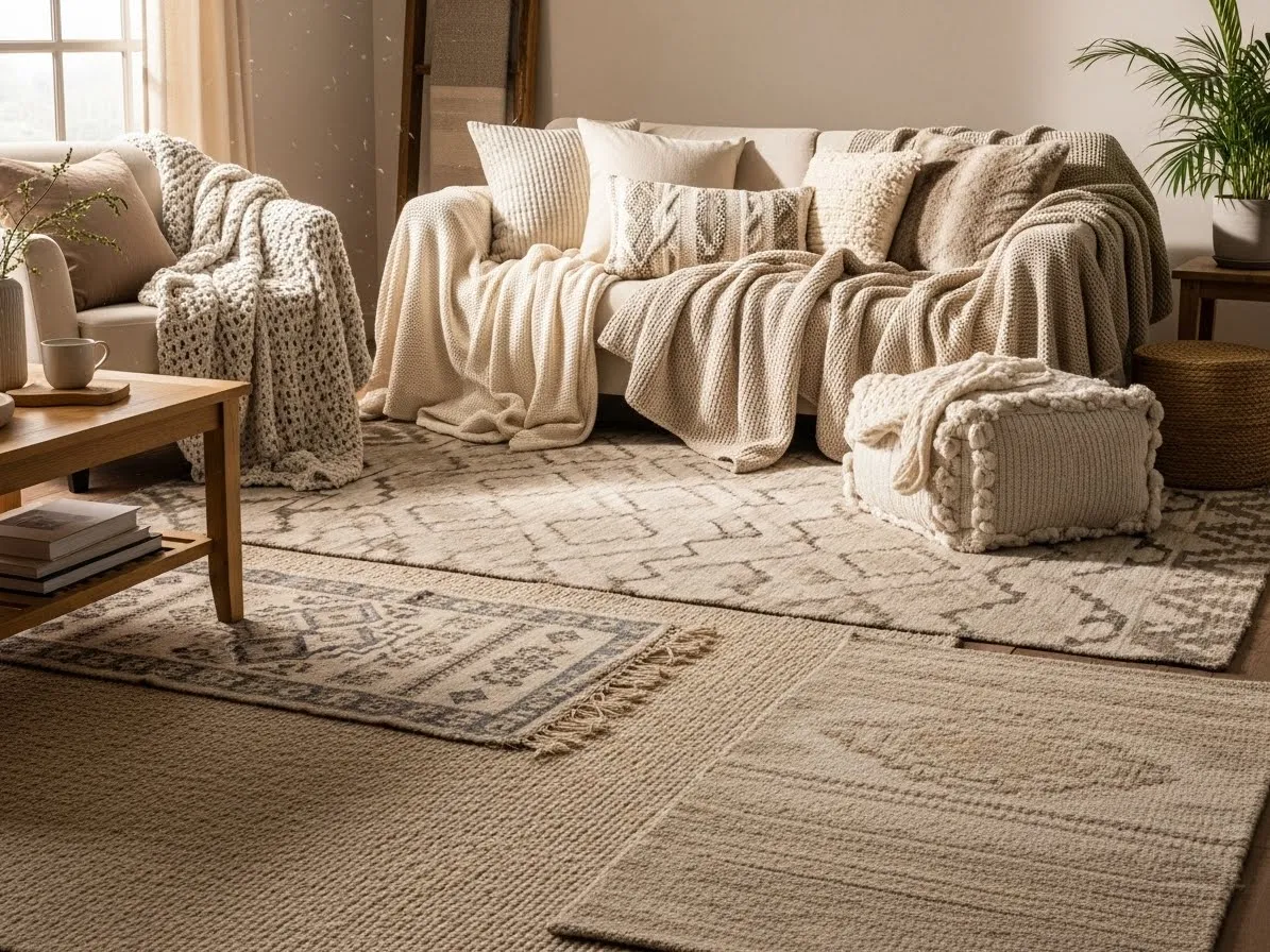 Texture layering is key: rugs on top of rugs, throw blankets, pillows, mixed fabrics. This trend carries over strongly into 2026, creating spaces that feel lived‑in and inviting.