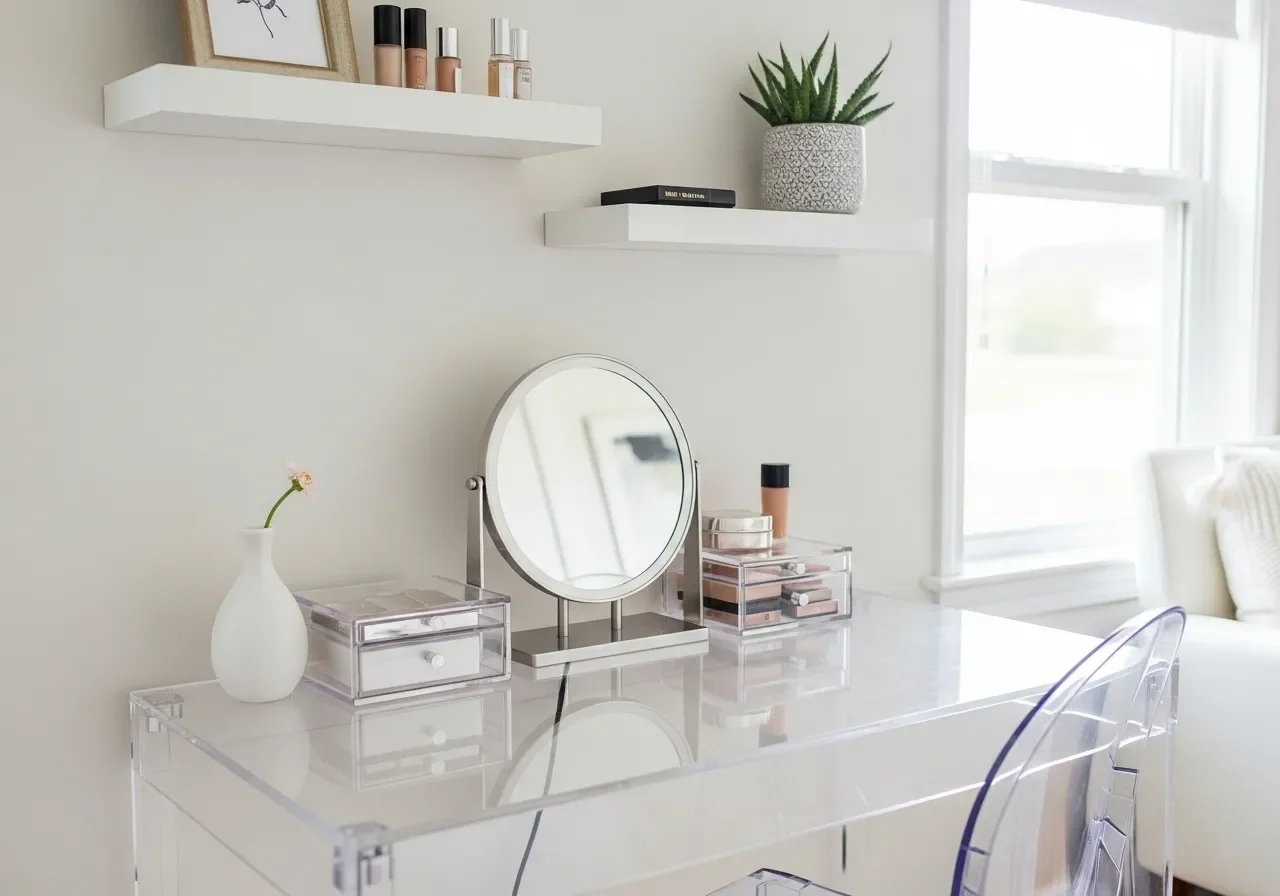 - Transparent Vanity – Clear acrylic keeps the room airy and modern.